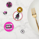 El Hot Pink 90's Retro Hip Hop Baby Shower for Baby Girl (Hip Hop para la niña retro) presenta: tablero de ajedrez blanco y negro sobre fondo de ladrillo blanco y pulverización con graffiti rosado caliente; traje de bebé negro con cadena de oro de mosca, micrófono, cuentagotas retro y más. Este divertido diseño urbano también dice: lírica "Ahh Push It". Añadir el nombre del bebé, los nombres de los padres y la fecha del evento. ¡Vaya! Todos los bebés duchan a los clientes con esta decoración de una mesa fiesta.