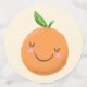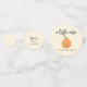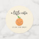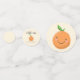 Pequeño confeti con tema de canguro en una mesa de ducha con un ilustracion a mano de una fruta naranja con una sonrisa adorable en su rostro. El texto dice "un poco de corbata está en camino". Este tema amarillo es ideal para una ducha neutra de género.