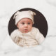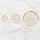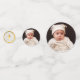 A un lado del confeti más grande y medio, hay una foto de un marcador de posición de un bebé de blanco de Vera Kratochvil de Public Domain Pictures; tiene un lanzamiento de modelo. En el otro lado, el texto dorado se encuentra en el interior de un círculo de mármol blanco con un Relieve metalizado de imitación de oro y una falsa cruz de oro encima. El nombre está escrito en un guión caligráfico elegante. El confeti más pequeño tiene justo la cruz dentro del círculo dorado a ambos lados.