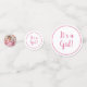 Una dulce ducha de bebé "es un chica", confeti con una bebé envuelta en blandas mantas blancas y rosas, acurrucadas con su gatito y rodeada de flores rosas.