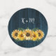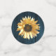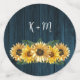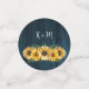 Decore las mesas de su próxima boda o despedida de soltera con Confeti de Mesa de Boda de Monograma de Girasol Azul Rústico. El diseño del confeti presenta un fondo de madera rústica con un elegante ramo de girasoles. Personalice con los monogramas de los novios.