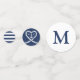 Contenti de mesa boda redondo azul y blanco. Ideal para un boda de la Marina (militar) o de la casa del lago. El diseño presenta una cuerda en forma de corazón con ancla y dos iniciales en el medio y rayas. Personalízalo con los detalles de su boda.