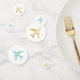 Esta decoración de confeti de mesa es perfecta para una boda de destino o un tema de viaje para una ducha de novia, fiesta de compromiso o celebración de recepción. Textura de hoja dorada falsa de avión a chorro con un pequeño corazón adorable, sobre un fondo blanco.