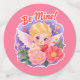Adorable Valentine's Day illustration of a cute blonde Cupid angel holding a red heart and golden arrow, surrounded by pink flowers and the romantic text "Be Mine!"