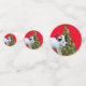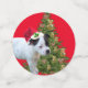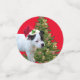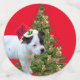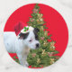 Fotografiado al lado de un árbol de Navidad con Staffy baubles es un cachorro Staffordshire en blanco y negro con un sombrero Santa