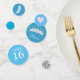 Dulce 16 Princesa tiara ornamentada con diamantes sobre la mesa azul turquesa claro Confetti. Textos y números listos para ser personalizados.