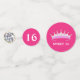 Corona de moda y piedras preciosas en la mesa de confeti rosa Magenta. Ideal para celebraciones de cumpleaños 15, 16, aniversario y otras festividades.