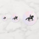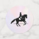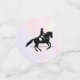 Confeti de mesa con un ilustracion blanco y negro de un jinete de ropa. El caballo y el jinete están tocando una pirueta. Elegante y hermoso. Colocado en un fondo acuático de colores pastel delicados y mullidos.