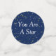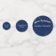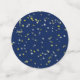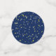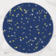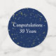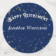 Texto feliz de retiro en un fondo azul oscuro con estrellas. Cambie el nombre al nombre del jubilado afortunado en el círculo grande, cambie los años en el círculo medio.