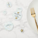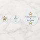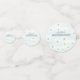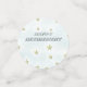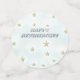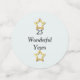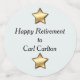 El frente de los círculos tiene detalles sobre el invitado de honor. La parte trasera tiene el texto Feliz Jubilación sobre un fondo turquesa pálido con pequeñas estrellas de oro.