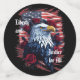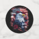 Muestra tu patriotismo con estilo. Este diseño presenta un águila calva rodeada de rosas rojas frente a una bandera estadounidense. Adecuado para el 4 de julio, Día de la Independencia o del Presidente, o cualquier fiesta nacional.