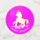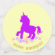 Bonita mesa de confeti con unicornio de cumpleaños feliz con antecedentes amarillos y ultravioletas. El texto "Feliz Cumpleaños" puede ser personalizado. Ideal para cumpleaños mágicos, duchas y otras celebraciones de fiestas!!!
