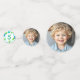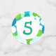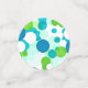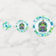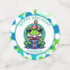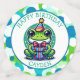 Fiesta de cumpleaños lindo para el cumpleaños de un niño. Una adorable rana en un gorra de cumpleaños sosteniendo un regalo con un lindo fondo de punto de polka azul y verde. Edite el texto en el área de personalización. Espolvorea alrededor de la mesa de regalo o de postre.