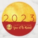Diseño moderno con papel de textura dorado (imagen impresa) con gran tamaño 2023 en rojo + pequeño tigre redondo cortado con textos amarillos HAPPY AÑO NUEVO y Año del Conejo sobre un fondo rojo. Diseño en fiesta confetti. Artículos de fiesta coincidentes, tarjeta de invitación cuadrada plana, tarjeta de saludo, postal de vacaciones y más... Perfecto para un Año Nuevo Chino del Conejo 2023 intemporal y moderno.