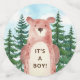 Diseño de un niño pequeño con un oso marrón con un bosque de abeto verde y un cielo azul acuarela. Fácil de personalizar con su información. Visite nuestra tienda para ver toda nuestra colección de osos de aventura.