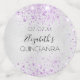 Elegante, glamuroso y jovial para una fiesta de 15 años de Quinceañera. Un falso fondo metálico plateado decorado con polvo de imitación purpurina morado y un vestido. Personalice y agregue un nombre y una fecha. El texto: Quinceañera y el nombre se escriben con letras modernas. Añade tu propia foto en dos de las fichas.