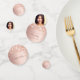 Confeti giratorio y femenino para tu mesa de cumpleaños número 21 (o cualquier edad). Un fondo de rosa decorado con confeti. Personalice y agregue una fecha y nombre/edad 21. Algunos confietti con nombre y fecha, otros con el texto: Feliz cumpleaños escrito con un moderno guión escrito a mano con chispas. Añade tu propia foto en dos de las fichas.