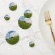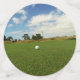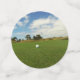 La foto es una pelota de golf en el verde con una bandera a lo lejos