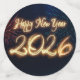 Happy New Year 2026 written with sparkle fireworks displayed on a dark night sky. Shiny bright glowing festive holiday illustration for New Year's and season's greetings.