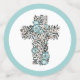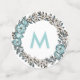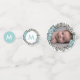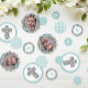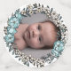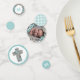 Hermoso confeti de mesa floral azul para un bautismo personalizado con la foto inicial y la foto de tu hijo. La mesa de bautismo infantil se mezcla con un marco floral de flores azules dibujado a mano, flores blancas, bayas y plantas y una cruz floral. Tabla de bautismo azul personalizada con foto e inicial. La mesa monogramada azul concuerda con la inicial de su bebé enmarcada por una flor azul.
