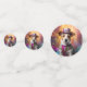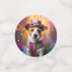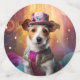 Un divertido Jack Russell Terrier vestido con un disfraz vibrante y caprichoso contra un fondo brillante y mágico. Este encantador diseño es perfecto para los amantes de los animales.