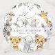 Add a personal touch to your birthday celebration with these stylish and memorable party items! Design features jungle animals (giraffe, zebra, lion, elephant, cheetah, meerkat, rhino) and eucalyptus leaves on white background.