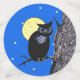 Este confeti de mesa tiene un búho negro con ojos azules sentado en un árbol negro con una luna amarilla llena y estrellas en un fondo azul del cielo nocturno. Los círculos medianos tienen una estrella amarilla y los pequeños círculos tienen una luna creciente.