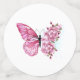 Arreglo floral de mariposa rosa con flores japonesas de cerezo rosadas sobre fondo blanco.