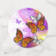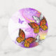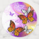 Naranja, mariposas monarcas detalladas sobre la luz, púrpura, pintoresco fondo pintado.