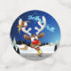 Un divertido reno de dibujos animados con una nariz roja brillante y grandes cuernos blancos, adornado con un lazo rojo y dorado, se asoma por una ventana abierta. Fuera, un paisaje nevado con siluetas de pinos y una pequeña casa iluminada es visible bajo un cielo nocturno azul oscuro lleno de estrellas. El trineo de Santa tirado por renos vuela en la distancia. La escena evoca una atmósfera navideña festiva y caprichosa. Arte Vectorial Original Copyright BluedarkArt TheChameleonArt.