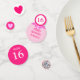 Moda 16º cumpleaños corazón en la Mesa Confetti rosa y blanca. Textos y números listos para ser personalizados. ¡Acento de imagen de diamante para un toque de elegancia!