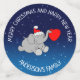 elefante lindo con gorra rojo y bolsa con regalos de Navidades sobre fondo azul con copos de nieve blancos