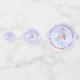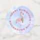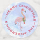 Un flamingo rosa lindo con una corona alrededor del cuello y coloridas bolas de Navidad sobre el fondo del hielo