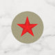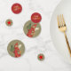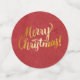 Este confeti de mesa tiene grandes círculos con un pequeño ángel victoriano rubio en una capa roja sosteniendo un pequeño árbol navideño sobre un fondo bronceado con flecos blancos. Los círculos medios son rojos con Feliz Navidad en Oro. Los pequeños círculos tienen una estrella roja brillante sobre el fondo del bronceado.