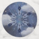 Copos de nieve azules y blancos sobre nubes blancas bajo un cielo estrellado.
