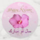 Noble y elegante ilustracion de Año Nuevo persa: Un hibisco rosa florece con deseos de Año Nuevo en inglés y farsi en un contexto bokeh.