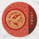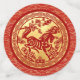 Una elegante imagen de un caballo dorado o rojo con flores en un círculo (inspirado en el tradicional corte chino de papel) con un círculo rojo o dorado domina un patrón asiático tradicional rojo y amarillo + gráfico "HAPPY NEW YEAR" en chino e inglés y antigua caligrafía china para "caballo" a la derecha en una banda de color rojo gradiente para el gran confeti. Diseño en papel fiesta. Tarjeta de felicitación coincidente, postal de vacaciones, tarjeta plana cuadrada, tarjeta plana redonda, tarjeta vertical plana y más pronto.
