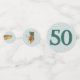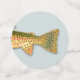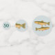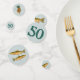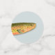 Confeti de la fiesta de cumpleaños del pescador de truchas. Las piezas redondas de confeti tienen imágenes de truchas localizadas, una mosca de pesca / jig, y la edad impresa en ambos lados y están en tres tamaños. Espolvorear sobre una mesa para añadir al tema de los fiestas festivos.