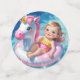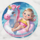 A cute young girl gently drifts on a pink and white unicorn float, gliding across a crystal-clear, blue swimming pool.