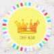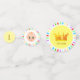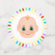 Elegantes rayos multicolores y adorable confeti de la primera fiesta de cumpleaños para bebés. Cara y corona de bebé. El texto se puede personalizar.