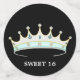 La princesa de moda corona por 16 cumpleaños en la mesa de confetti azul turquesa y negro. Ideal para celebraciones de cumpleaños 15, 16, aniversario y otras festividades.