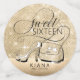 Celebra tu evento Sweet Sixteen con estilo con este cuadro de confección con una fuente decorativa única en un estilo retro de moda, con atractivos antecedentes tanto en oro brillante como brillante con acentos de accesorios de moda de moda. El número impactante "Dieciséis" en un efecto purpurina de oro espumoso es opcional y puede eliminarse para utilizarla en otras ocasiones. Utilice la plantilla proporcionada para agregar el nombre y la fecha de nacimiento de una celebridad. Busque ID675 para ver otros productos y opciones de color para este diseño.