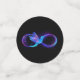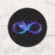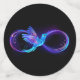 Símbolo de infinito violeta y brillante con colibrí azul sobre fondo negro. Neón.
