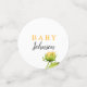Dulce y rústico confeti de ducha de bebé de girasol con ilustracion acuarela de un girasol amarillo con fondo de madera de grano. El texto dice "un bebé está floreciendo".