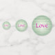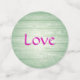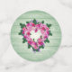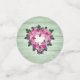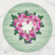 Rosas rosadas en una corona en forma de corazón colgando en una pared de madera pintada de verde pálido. Un hermoso diseño de corazón casual que hace un tema hermoso para una fiesta de shower nupcial, boda, aniversario o fiesta del Día de San Valentín.