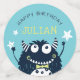 El delicioso confetti personalizado para la fiesta de cumpleaños de tu pequeño monstruo cuenta con una variedad de diseños para deleitar a tus invitados fiestas y añadir un toque personalizado único a tus mesas. Personaliza este diseño temático genial de monstruo con una foto del niño de cumpleaños, su edad, nombre y fecha de nacimiento, en un fondo marino y verde azulado decorado con estrellas dibujadas a mano blanca y un monstruo sonriente lindo adornado con una corbata de arco verde lima.