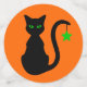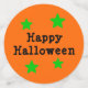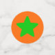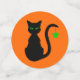 Confeti espeluznante para Halloween. Grande y mediano tiene un gato negro con una estrella verde colgando de su cola. El gran tamaño tiene "Halloween feliz" y estrellas verdes por un lado. La pequeña tiene una estrella verde a juego. Todos tienen antecedentes naranjas.