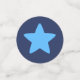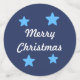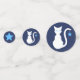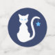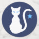 Confiti festivo para Navidades. Grande y mediano tiene un gato blanco con una estrella azul helada colgando de su cola. El gran tamaño tiene "Feliz Navidad" y estrellas por un lado. Pequeño tiene una estrella de hielo a juego. Todos tienen un fondo azul marino.