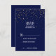 Esta elegante tarjeta Gold Confetti on Navy Blue RSVP es perfecta para un elegante fiesta jubilatorio. El diseño presenta un confetti falso purpurina dorado sobre un fondo azul marino con caligrafía blanca.