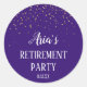 Estos sellos para sobres Gold Confetti en fiestas Purple para jubilados son perfectos para un elegante fiesta jubilatorio o recepción. El diseño se caracteriza por un confetti de oro falso sobre un fondo morado con caligrafía blanca elegante. Personaliza a los pegatinas con el nombre del jubilado.
